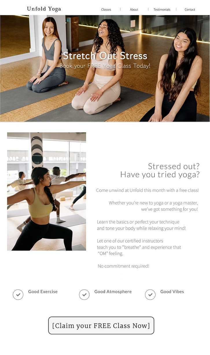 Everybody’s stressed. Not everybody knows about the stress relieving properties of yoga. This landing page is an invitation to learn a little more, no strings attached.